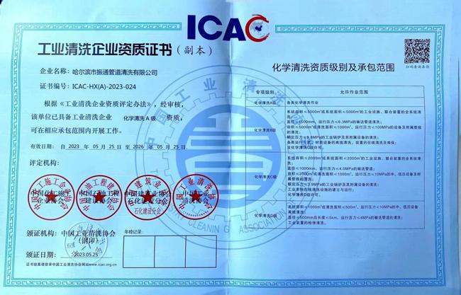 •   哈爾濱市振通管道清洗有限公司,是集管道清洗技術(shù)研究、清洗設(shè)備研發(fā)制造和管道清洗施工服務(wù)三位一體的科技型管道清洗技術(shù)服務(wù)公司。是國(guó)家清洗行業(yè)協(xié)會(huì)會(huì)員單位,具有協(xié)會(huì)頒發(fā)的物理清洗資質(zhì)B級(jí)、化學(xué)清洗A級(jí)資質(zhì)和安全生產(chǎn)作業(yè)證書(shū)。是黑龍江省高新技術(shù)企業(yè),是全國(guó)科技創(chuàng)新先進(jìn)單位。具有國(guó)家發(fā)明專利2項(xiàng),實(shí)用新型專利8項(xiàng)。現(xiàn)有人員45人,其中科技人員17人。是民用供水管道清洗行業(yè)龍頭企業(yè)。公司成立二十多年來(lái),應(yīng)用先進(jìn)的氣壓脈沖清洗和化學(xué)清洗等技術(shù),為全國(guó)自來(lái)水公司、供暖公司做管道清洗技術(shù)服務(wù)共400多項(xiàng),有效的為使用單位凈化供水水質(zhì)、提高供暖溫度,均收到了非常理想的效果,受到了用戶廣泛好評(píng)...